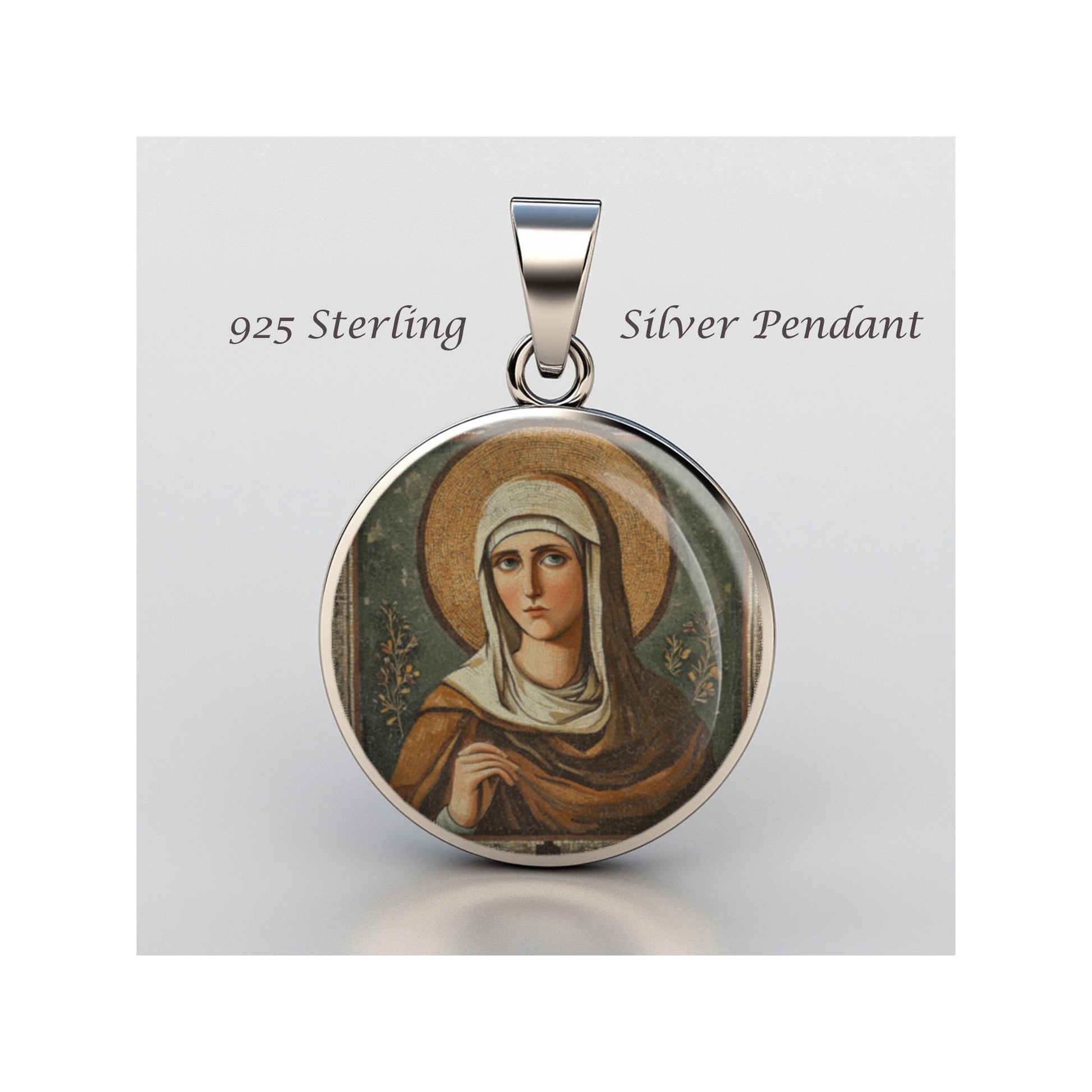Dedicated to Saint Theodora Of Alexandria, this 20mm sterling silver pendant features a delicate design under a clear glass dome, crafted with high-quality paper. The pendant comes in a beautiful jewelry box, ready for gifting—perfect for birthdays, anniversaries, Christmas, Easter, Baptism, First Communion, Confirmation, Mother's Day, or as a thoughtful gift for a loved one.