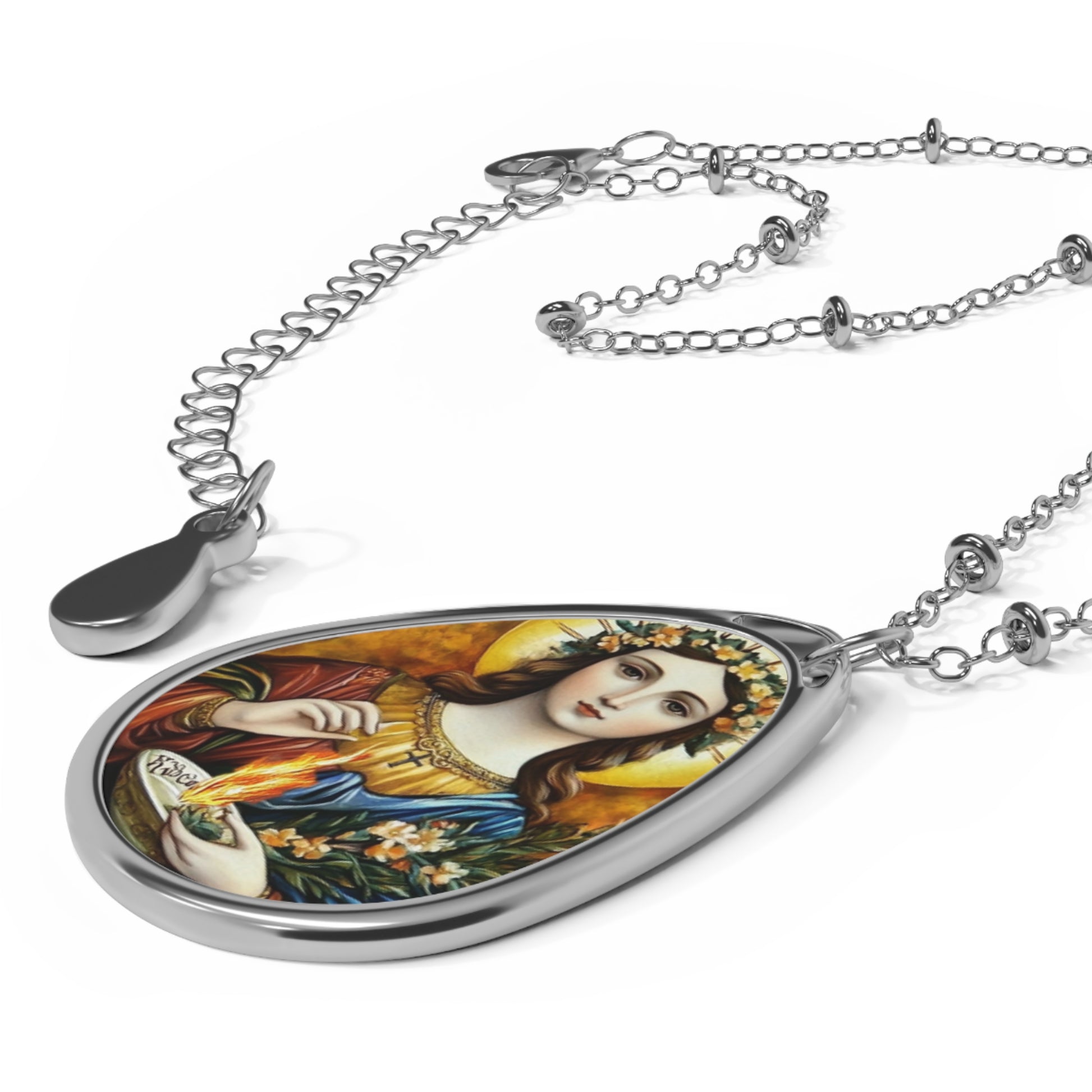 St. Agatha Oval Drop Pendant Necklace - Silver Tone Medal