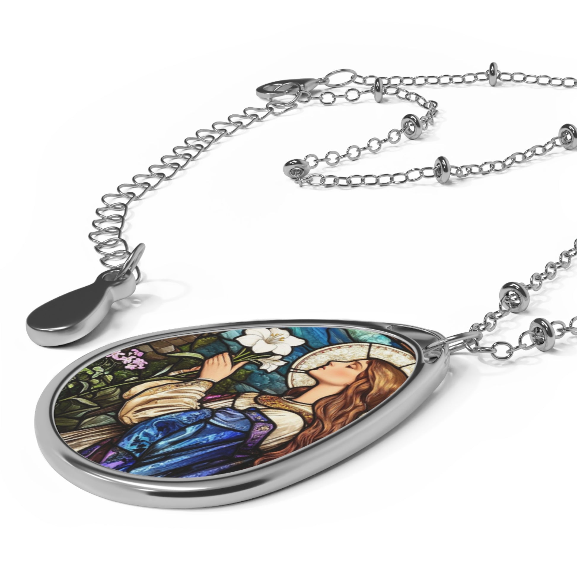 St Agnes Necklace Drop Oval Pendant Silver Tone Medal