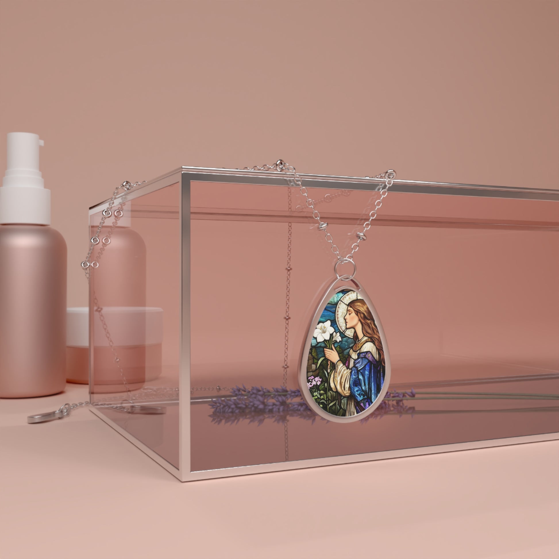 The pendant and chain are crafted from durable brass, offering a long-lasting, eye-catching shine. The image is printed on an aluminum panel and set in a uniquely shaped elliptical pendant.