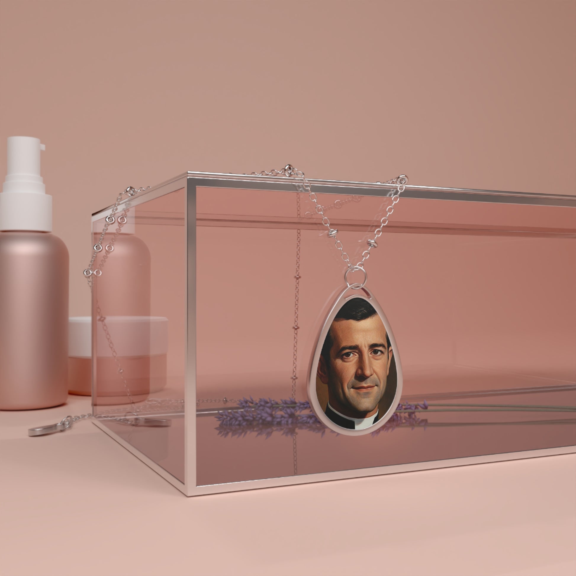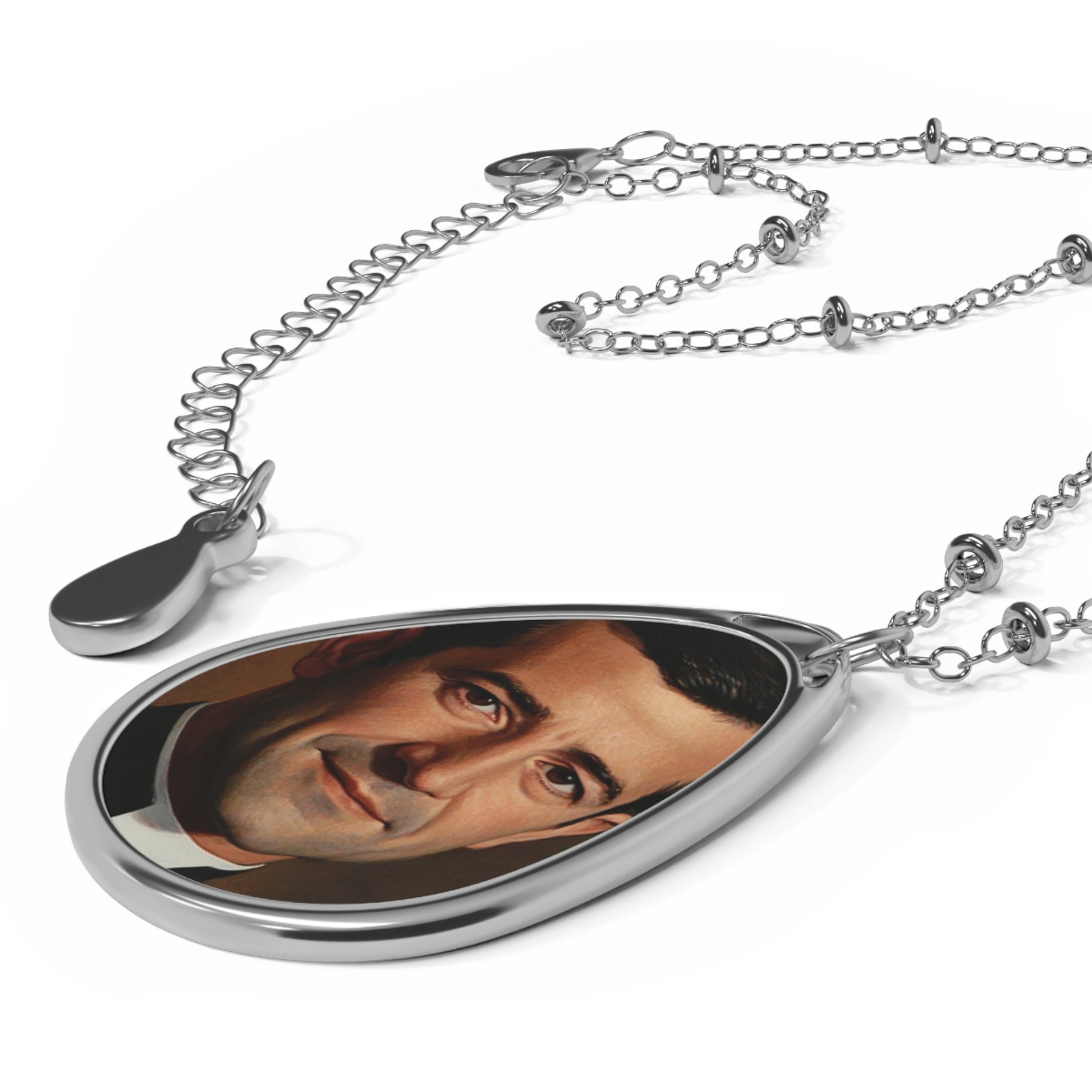The pendant and chain are crafted from durable brass, offering a long-lasting, eye-catching shine. The image is printed on an aluminum panel and set in a uniquely shaped elliptical pendant.
