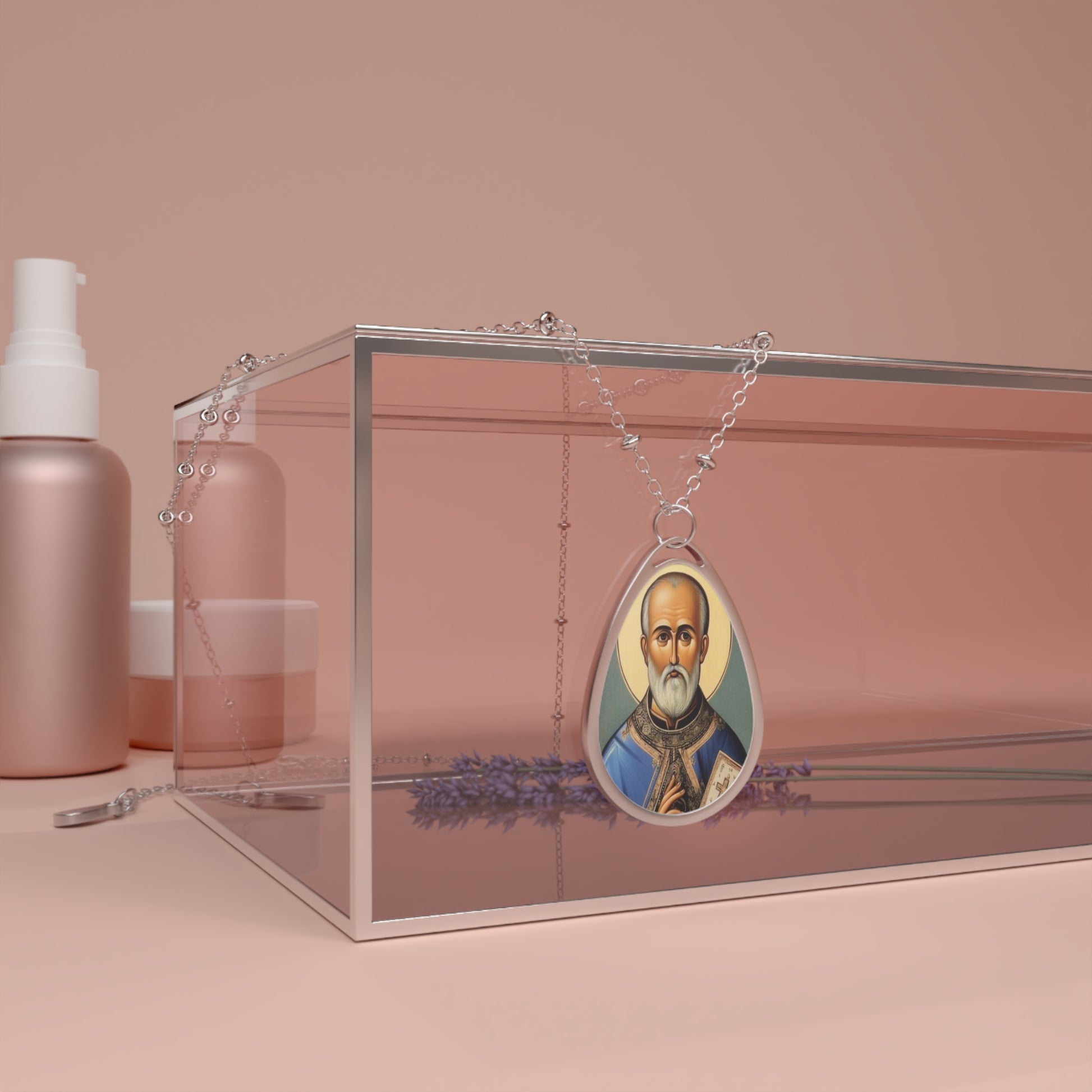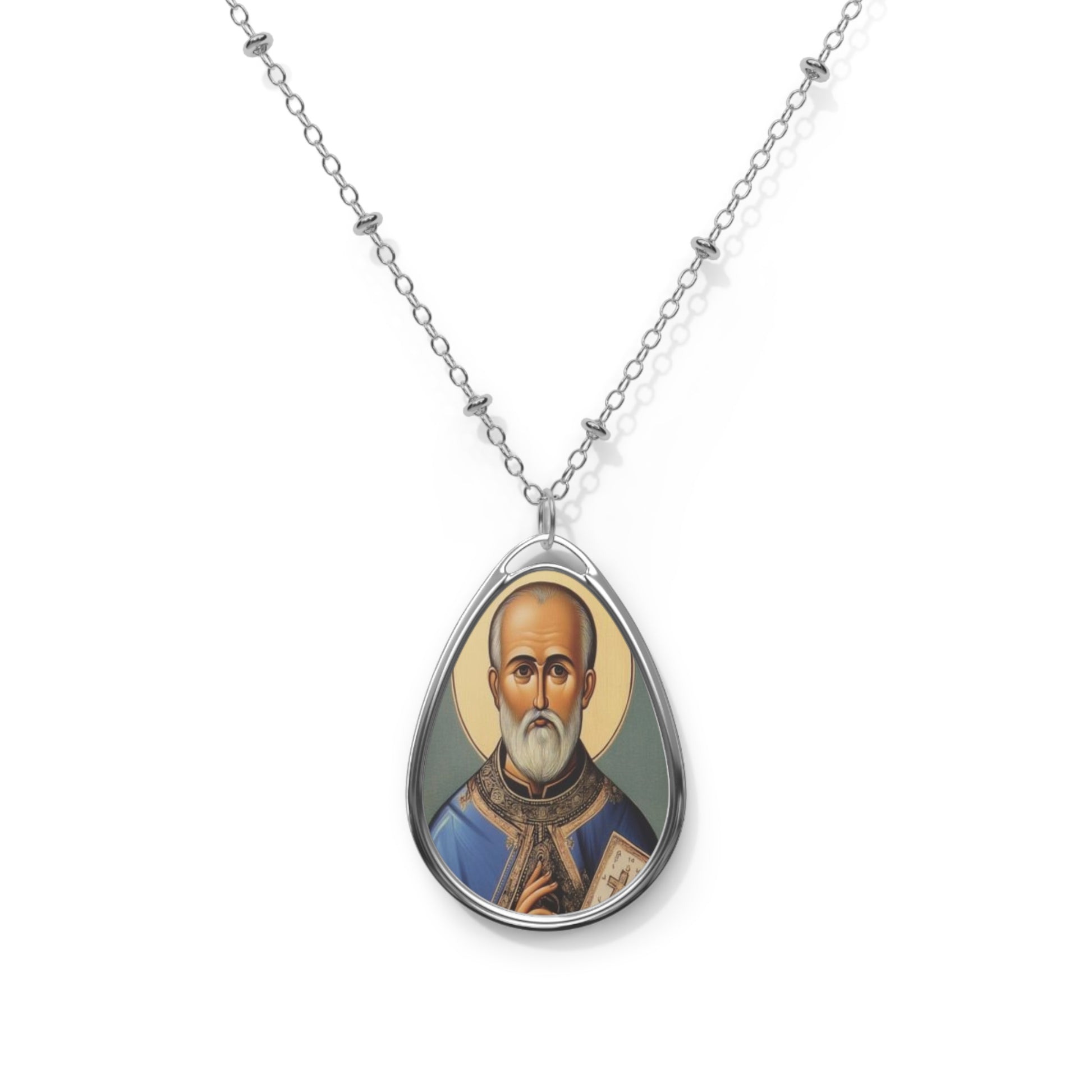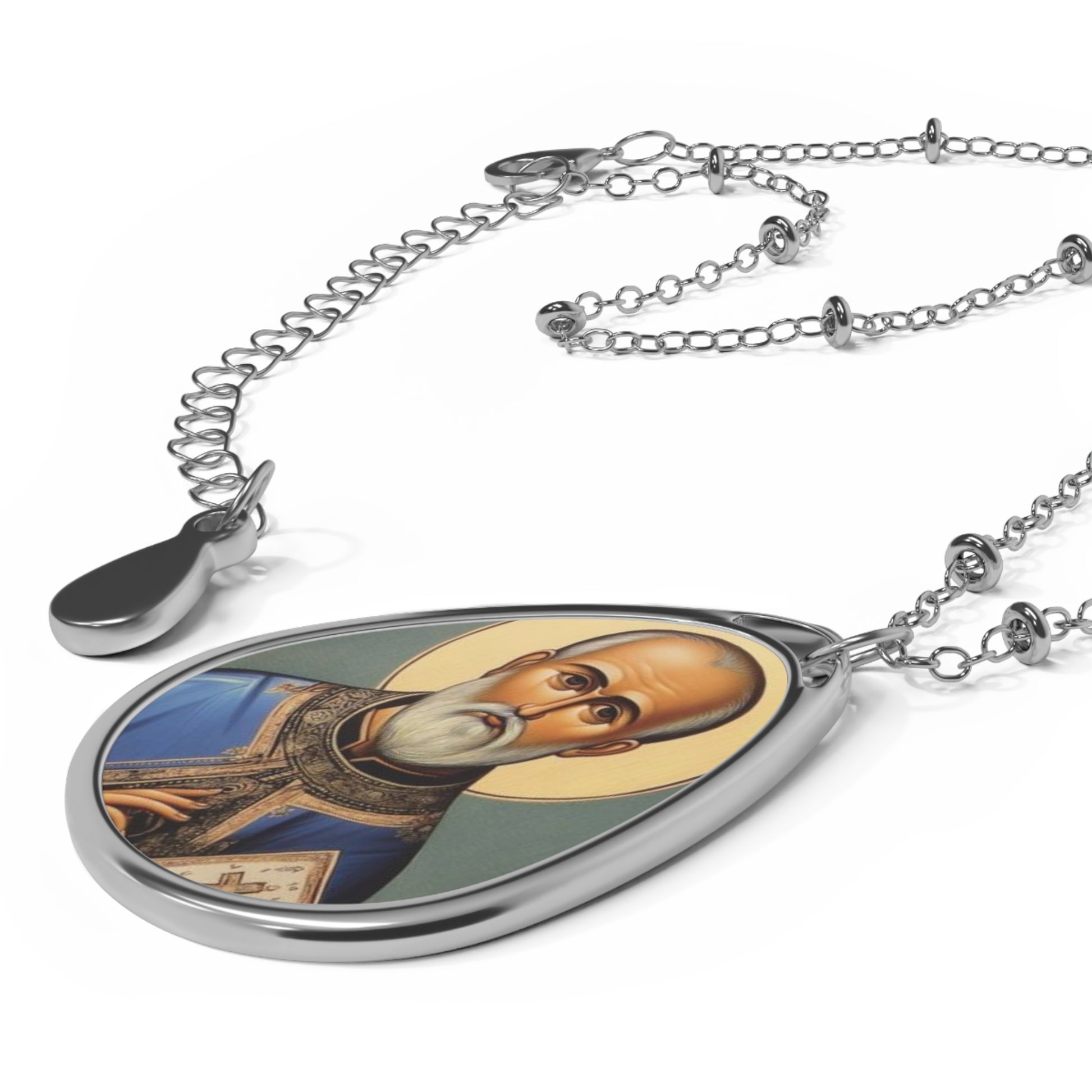 The pendant and chain are crafted from durable brass, offering a long-lasting, eye-catching shine. The image is printed on an aluminum panel and set in a uniquely shaped elliptical pendant.