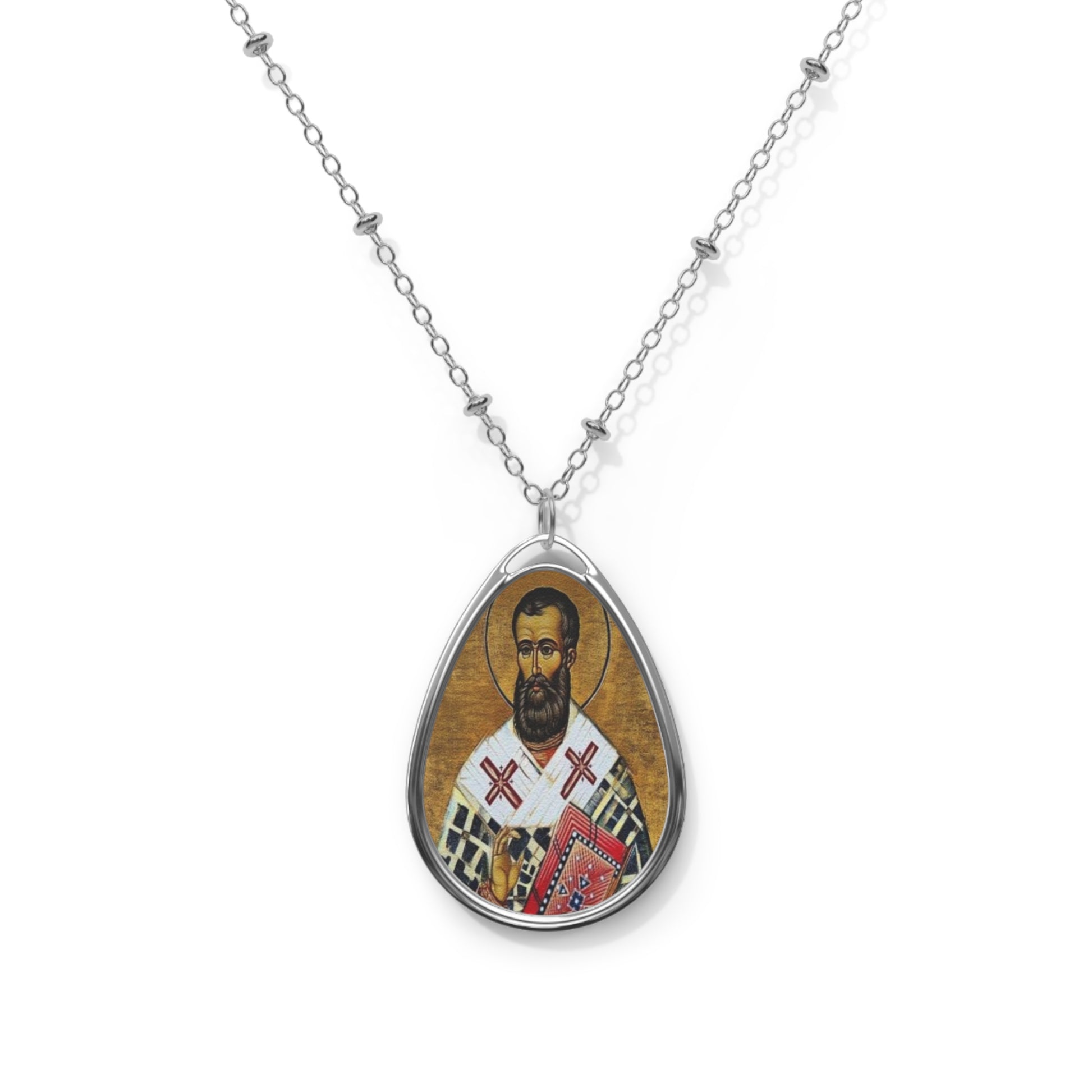 The pendant and chain are crafted from durable brass, offering a long-lasting, eye-catching shine. The image is printed on an aluminum panel and set in a uniquely shaped elliptical pendant.