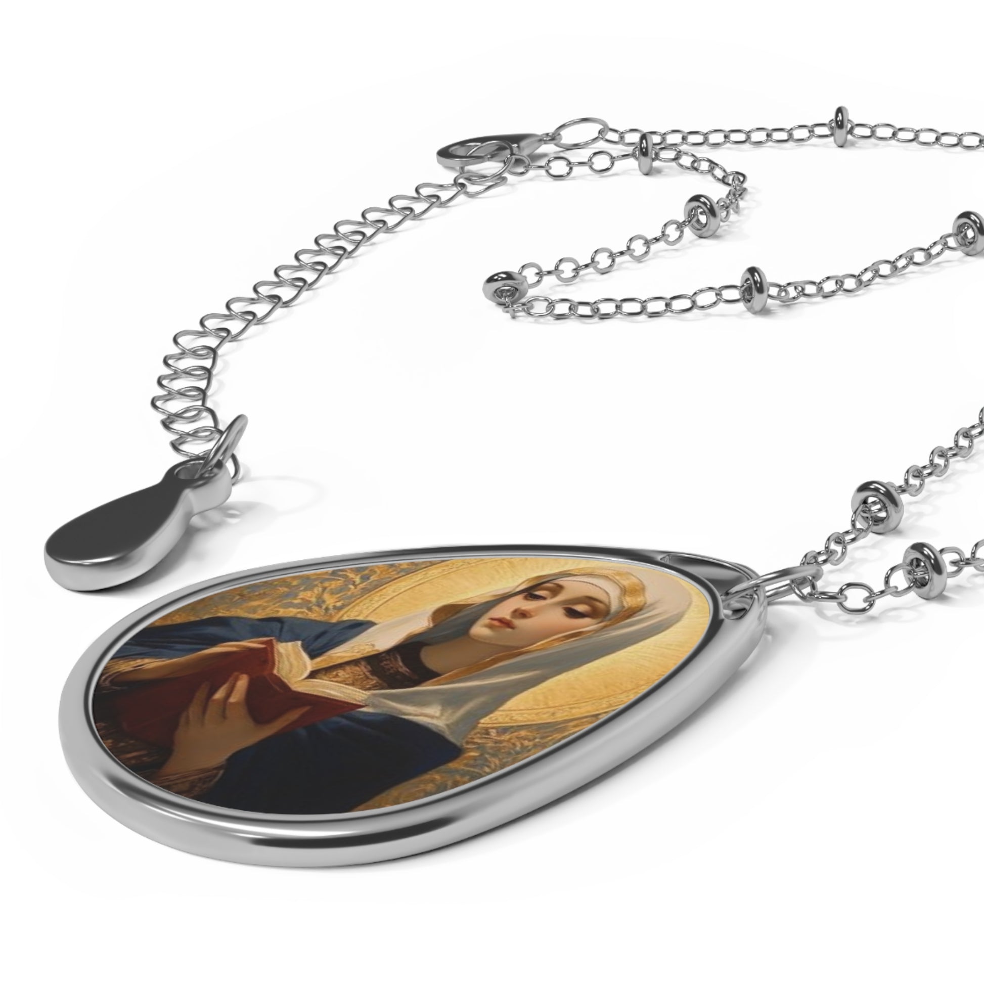 The pendant and chain are crafted from durable brass, offering a long-lasting, eye-catching shine. The image is printed on an aluminum panel and set in a uniquely shaped elliptical pendant.