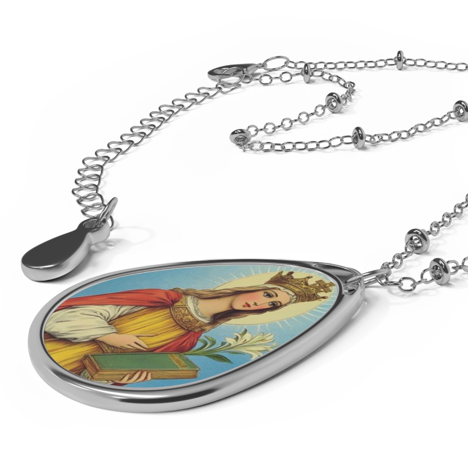The pendant and chain are crafted from durable brass, offering a long-lasting, eye-catching shine. The image is printed on an aluminum panel and set in a uniquely shaped elliptical pendant.