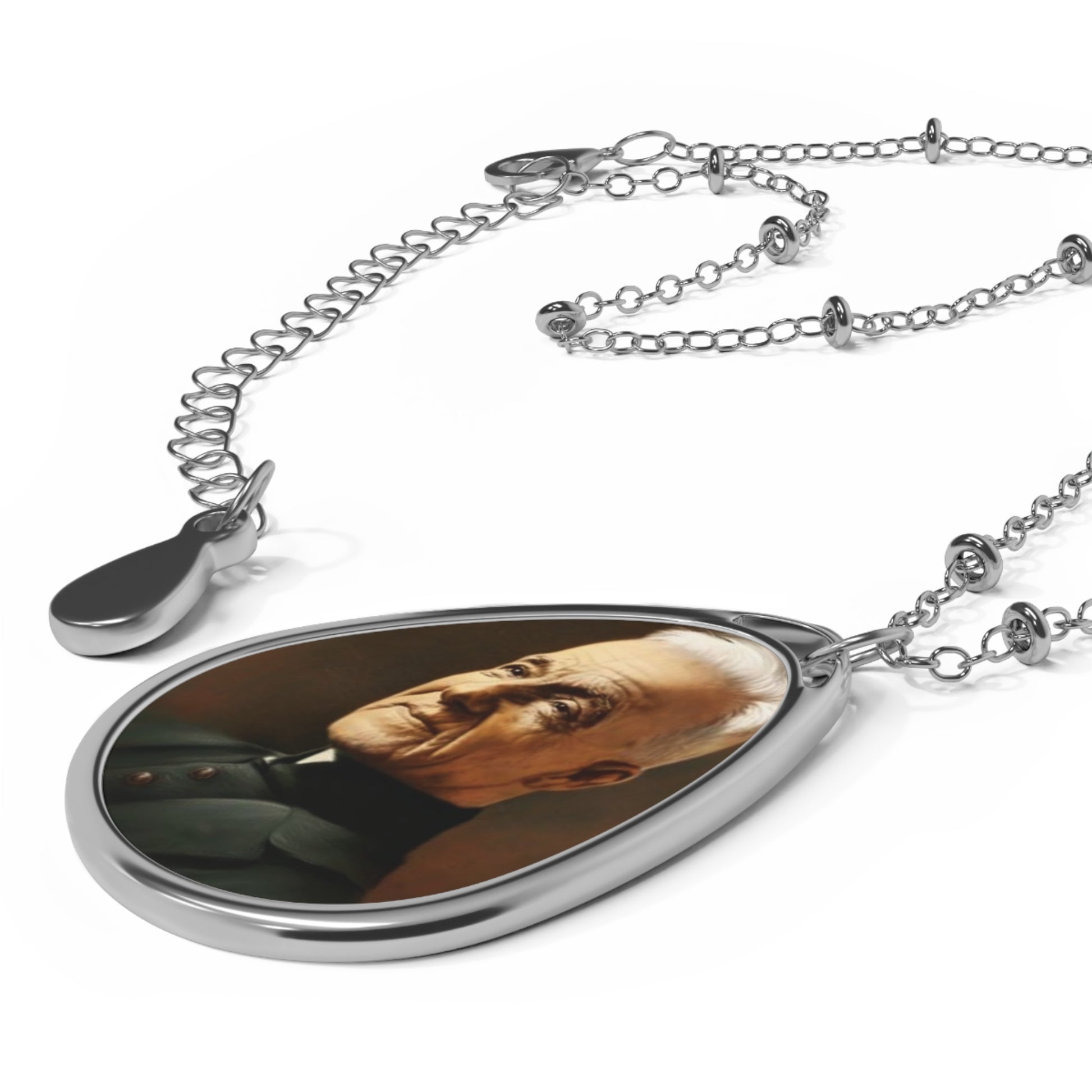 The pendant and chain are crafted from durable brass, offering a long-lasting, eye-catching shine. The image is printed on an aluminum panel and set in a uniquely shaped elliptical pendant.