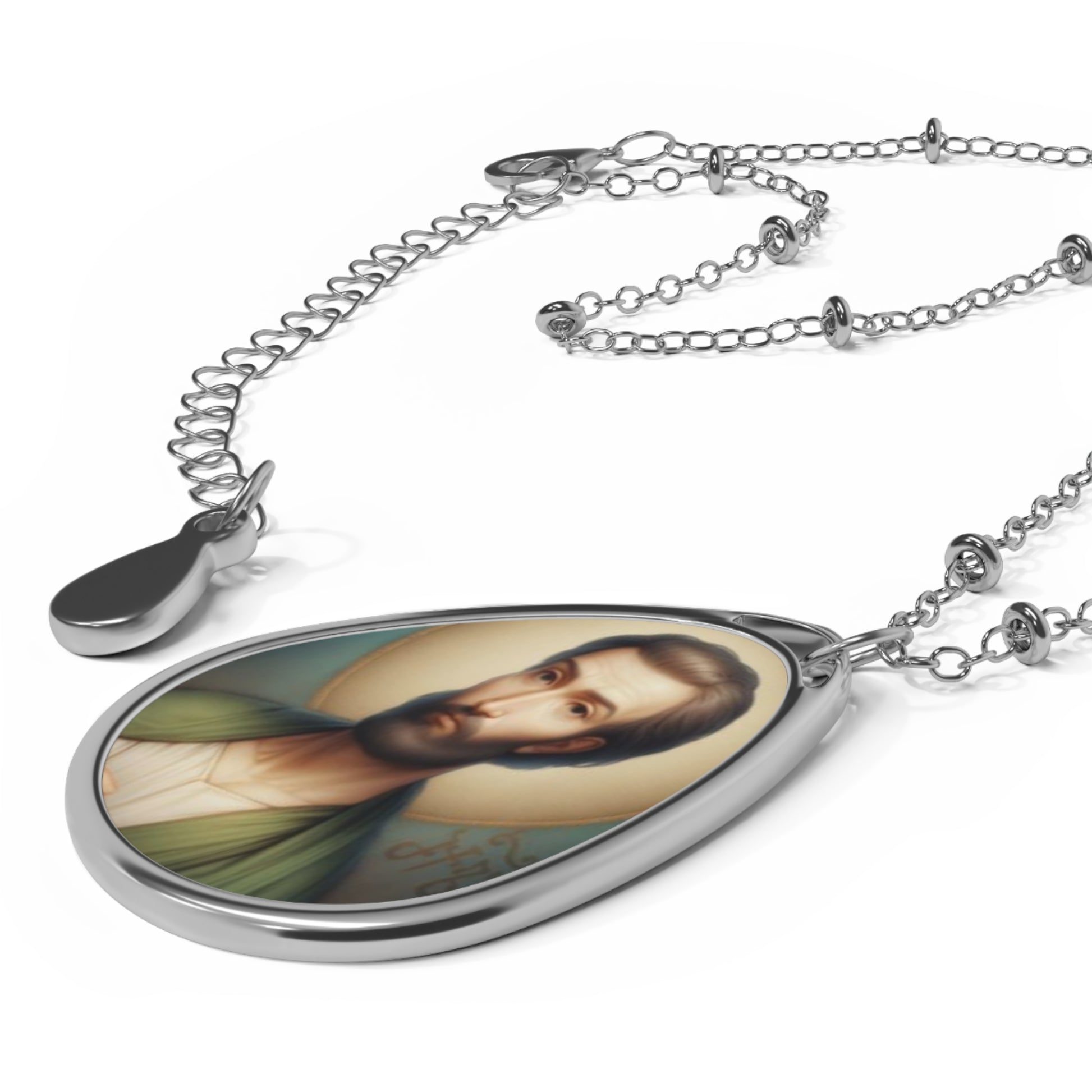 The pendant and chain are crafted from durable brass, offering a long-lasting, eye-catching shine. The image is printed on an aluminum panel and set in a uniquely shaped elliptical pendant.