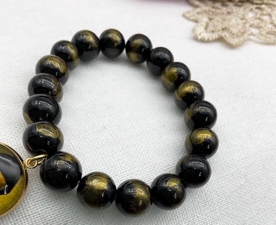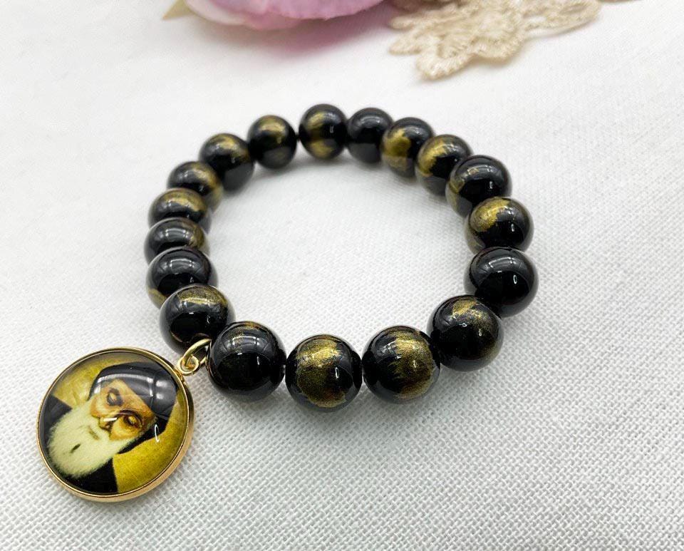 St Charbel Catholic Stretch Bracelet Black and Gold Lapis Lazuli Jades Beads