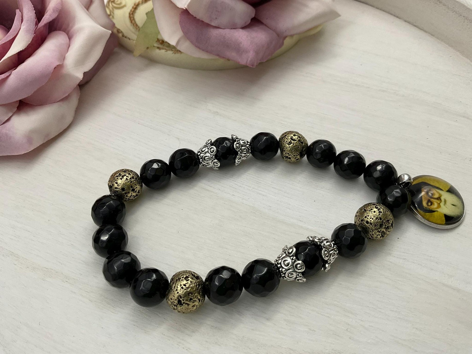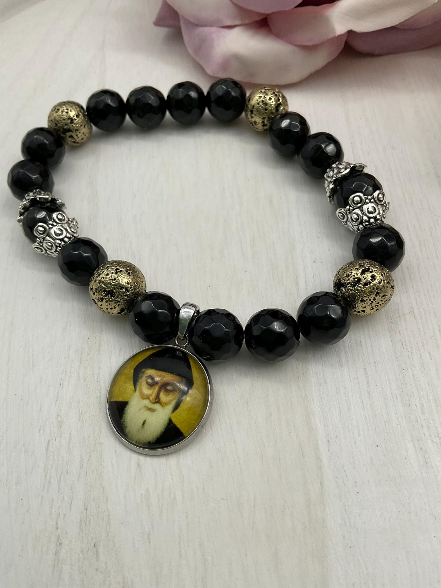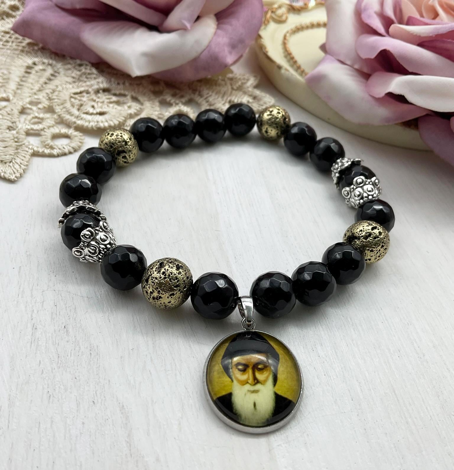 St Charbel Catholic Stretch Bracelet | Black Onyx and Gold Lava Stone Saint Charbel Charm Pendant