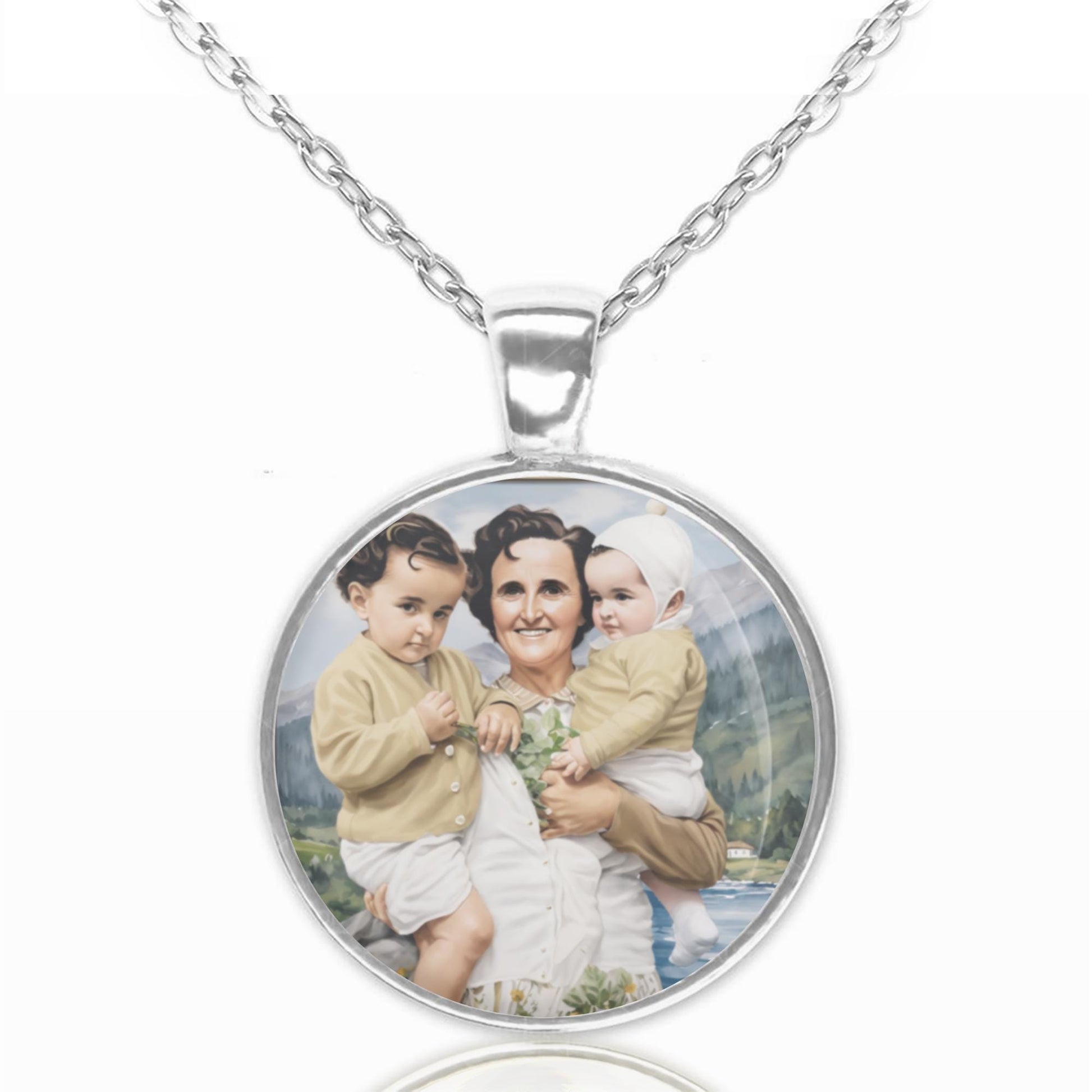 The pendant is made from a durable metal alloy base, topped with a glass cabochon that highlights the fine, high-resolution image with exceptional detail.