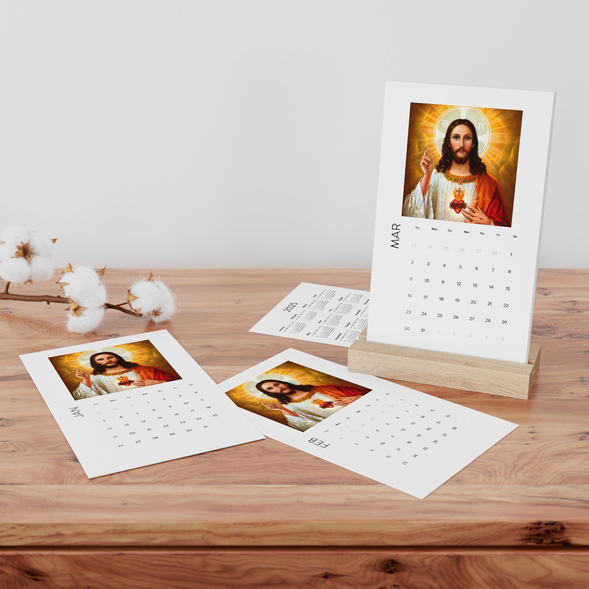 This vertical desk calendar features a Sacred Heart Jesus design, creating a serene and spiritual atmosphere for your workspace. Perfect for those looking to add a touch of faith and inspiration to their daily routine. Ideal for religious individuals or those looking for meaningful decor. Relevant for Easter, Christmas, and religious observances.